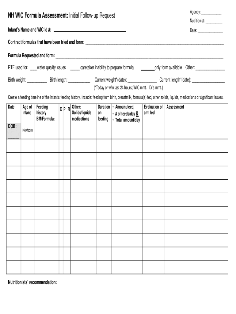 Agency: NH WIC Formula Assessment: Initial Followup RequestNutritionist: Infants Name and WIC I'd #:Date: Contract formulas that have been tried and form: Formula Requested and form: RTF used for: