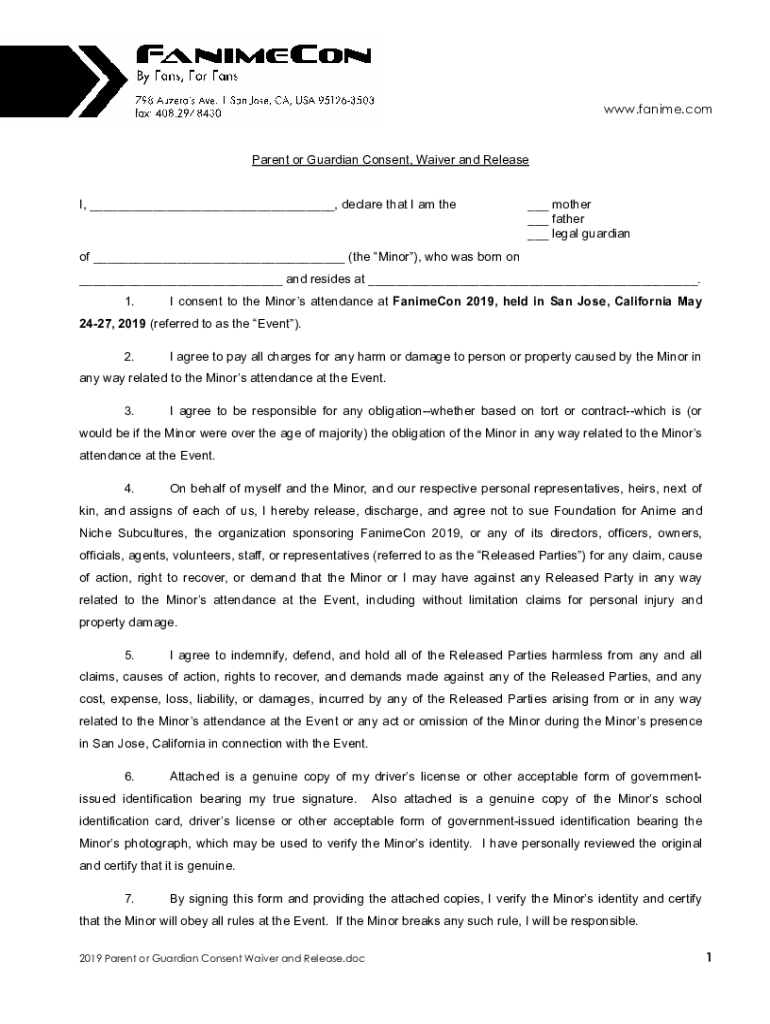 WWW.anime.company or Guardian Consent, Waiver and Release I, declare that I am the mother father legal guardian of (the Minor), who was born on and resides at. 1. I consent to the Minors' attendance