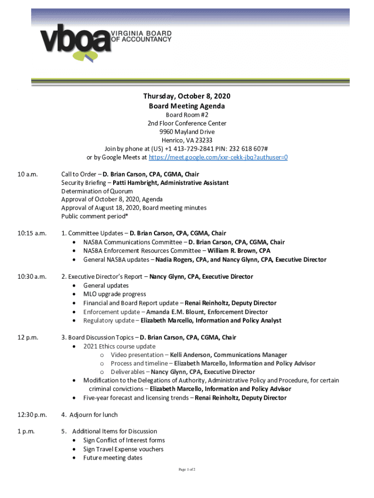 Thursday, October 8, 2020, Board Meeting Agenda Board Room #2 2nd Floor Conference Center 9960 Maryland Drive Enrico, VA 23233 Join by phone at (US) +1 4137292841 PIN: 232 618 607# or by Google Meets