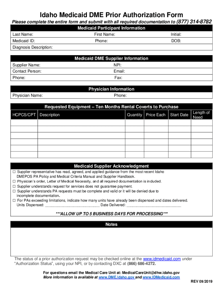 Idaho Medicaid DME Prior Authorization Form Please complete the entire form and submit with all required documentation to (877) 3148782 Medicaid Participant Information Last Name:First Name:Initial:Medicaid