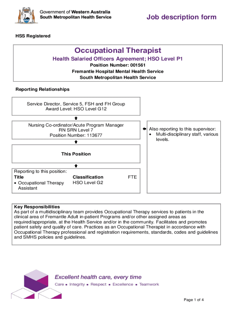 Job description form HSS RegisteredOccupational Therapist Health Salaried Officers Agreement; SO Level P1 Position Number: 001561 Fremantle Hospital Mental Health Service South Metropolitan Health