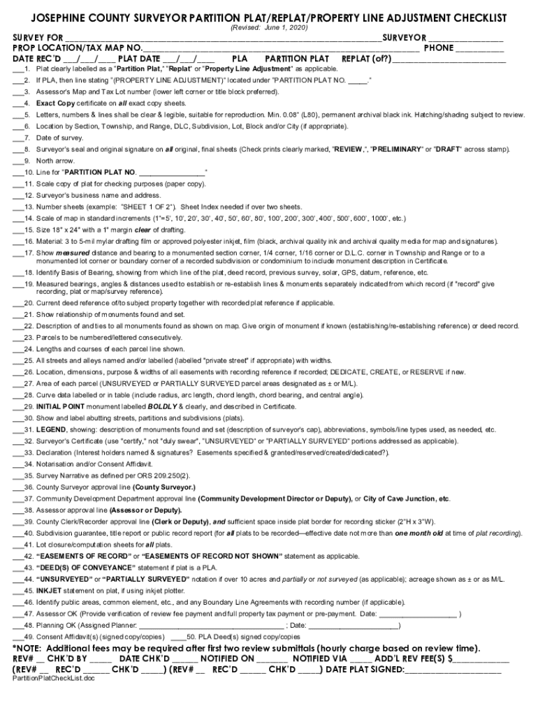 JOSEPHINE COUNTY SURVEYOR PARTITION PLAT/REPEAT/PROPERTY LINE ADJUSTMENT CHECKLIST (Revised: June 1, 2020)SURVEY FOR SURVEYOR PROP LOCATION/TAX MAP NO. PHONE DATE RECD / / PLAT DATE / / PLA PARTITION