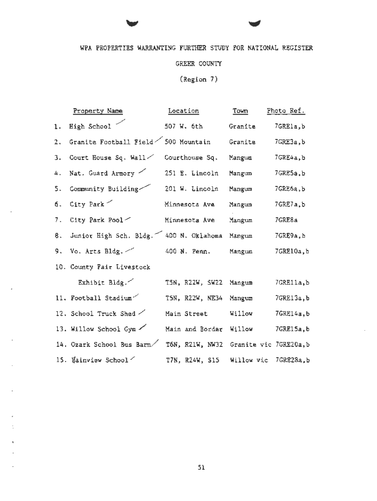 WPA PROPERTIES WARRANTING FURTHER STUDY FOR NATIONAL REGISTER
