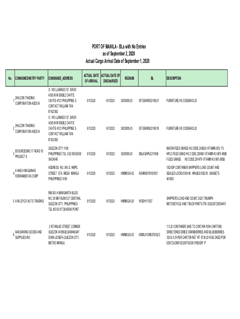 PORT OF MANILA BLS with No Entries as of September 2, 2020, Actual Cargo Arrival Date of September 1, 2020 No.CONSIGNEE/NOTIFY PARTY12HILCON TRADING CORPORATION ADDS N22HILCON TRADING CORPORATION
