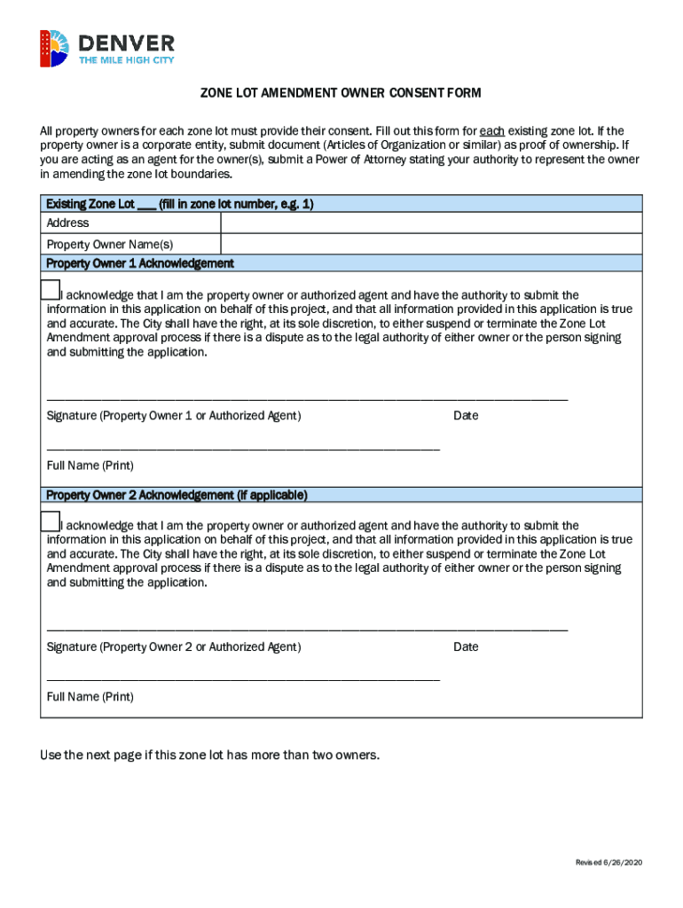 Get the free Zone lot amendment owner consent form - Denver