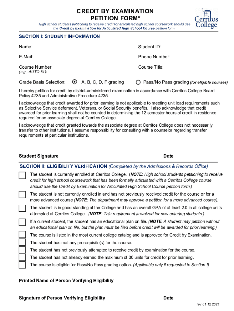 PETITION FORM×High school students petitioning to receive credit for articulated high school coursework should use