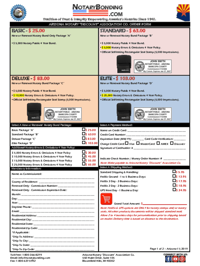 NOTARYBONDING .COM Tradition of Trust & Integrity Empowering Americas Notaries Since 1940. ARIZONA NOTARY DISCOUNT ASSOCIATION CO. ORDER FORM BASIC $25.00STANDARD $63.00New or Renewal Notary Bond