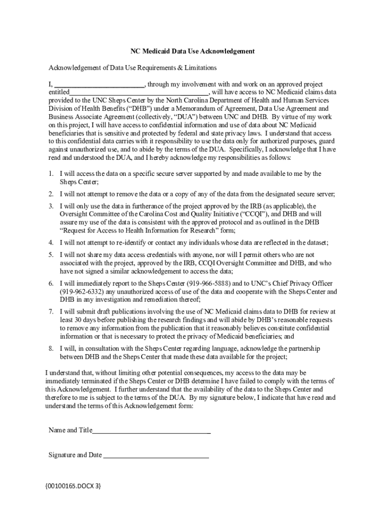 Get the free NC Medicaid Data Use Acknowledgement - Sheps Center