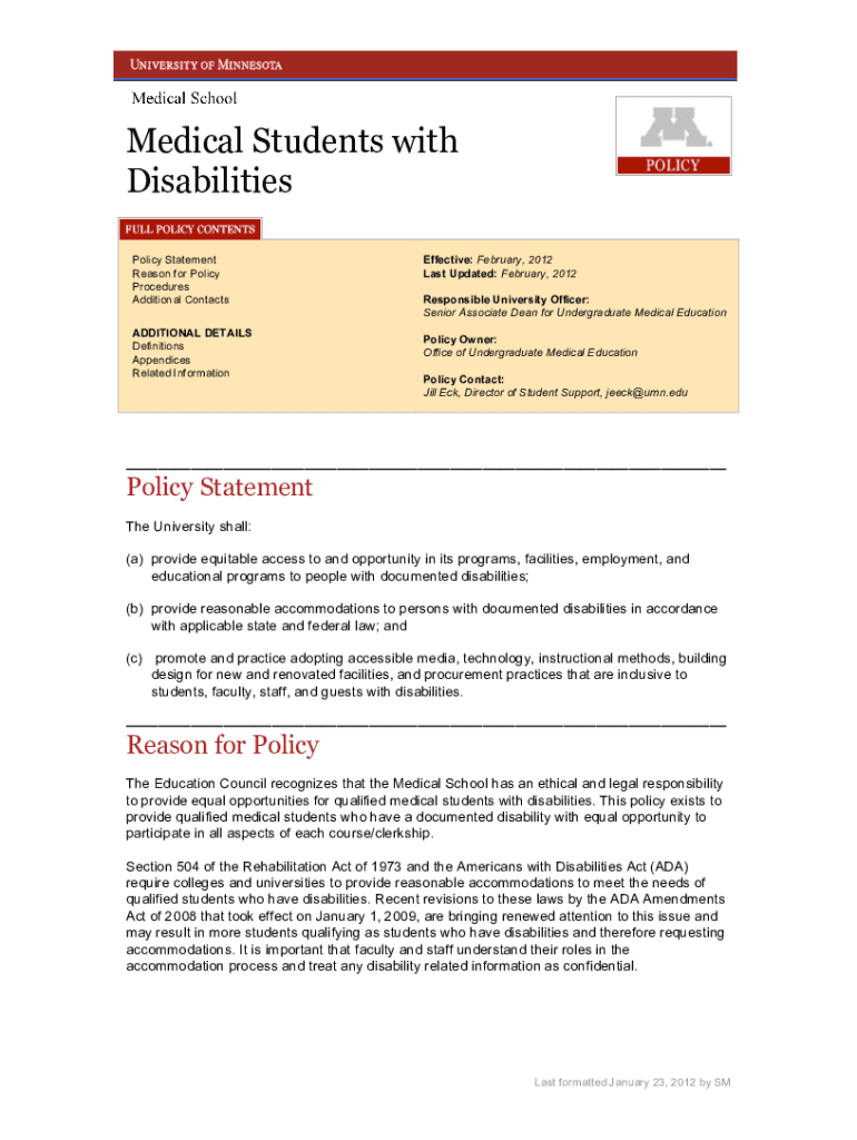 Medical Students with Disabilities Policy Statement Reason for Policy Procedures Additional Contacts ADDITIONAL DETAILS Definitions Appendices Related InformationEffective: February 2012 Last Updated: