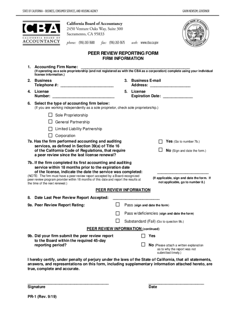 PEER REVIEW REPORTING FORM FIRM INFORMATION 1. Accounting Firm Name: (If operating as a sole proprietorship (and not registered as with the CBA as a corporation) complete using your individual license