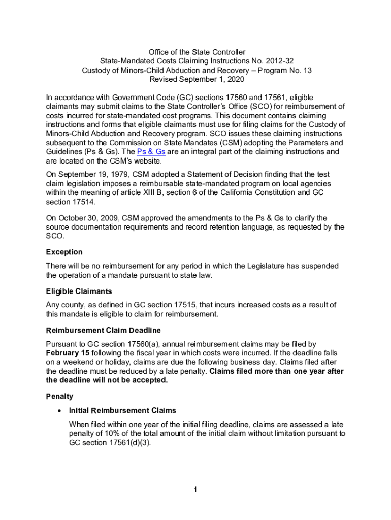 Office of the State Controller Statemented Costs Claiming Instructions No. 201232 Custody of MinorsChild Abduction and Recovery Program No. 13 Revised September 1, 2020, In accordance with Government