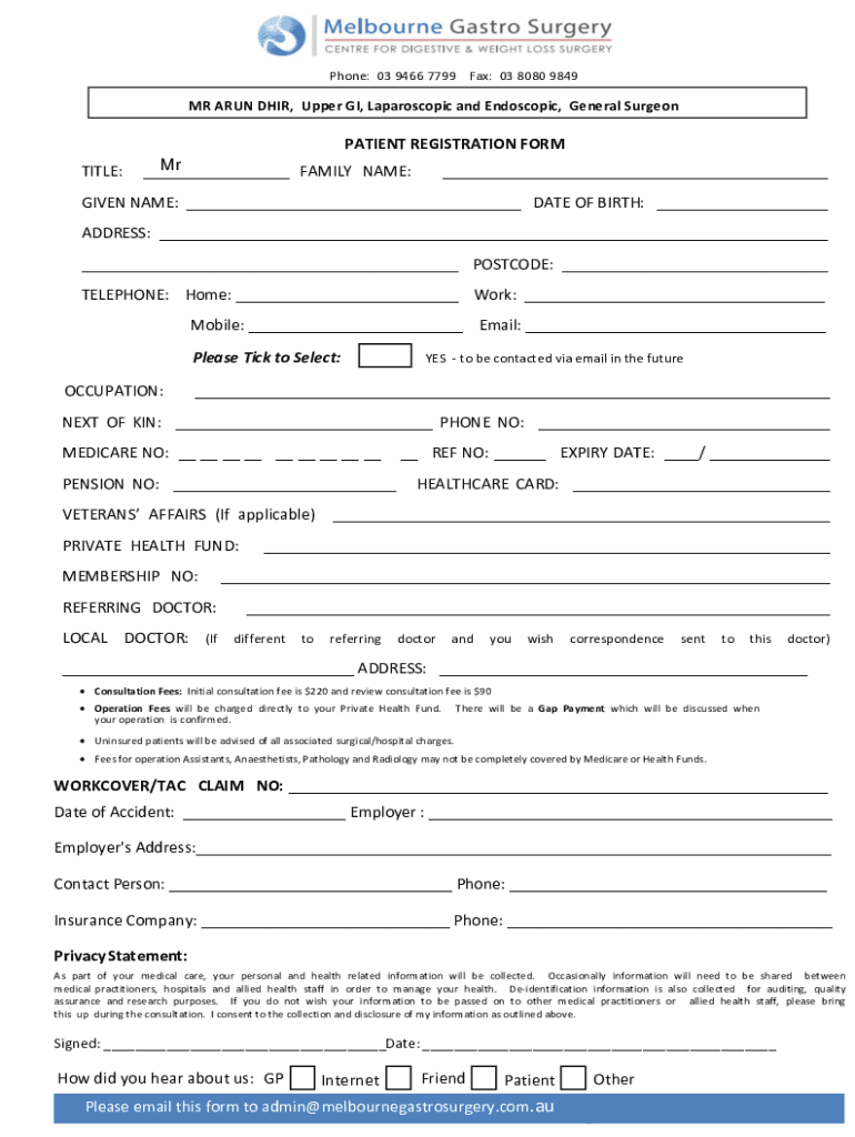 Phone:03 9466 7799Fax:03 8080 9849MR ARUN DIR, Upper GI, Laparoscopic and Endoscopic, General SurgeonPATIENT REGISTRATION FERTILE: FILENAME: GIVEN NAME: DATE OF BIRTH: ADDRESS: POSTCODE: TELEPHONE:Home: