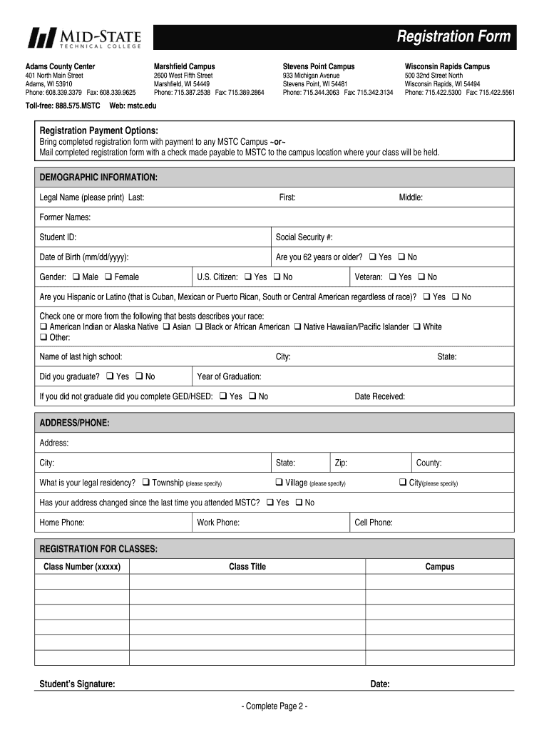 The form is intended for students wishing to enroll in classes at Mid-State Technical College in Wisconsin. Prospective and current students should use this form to register.