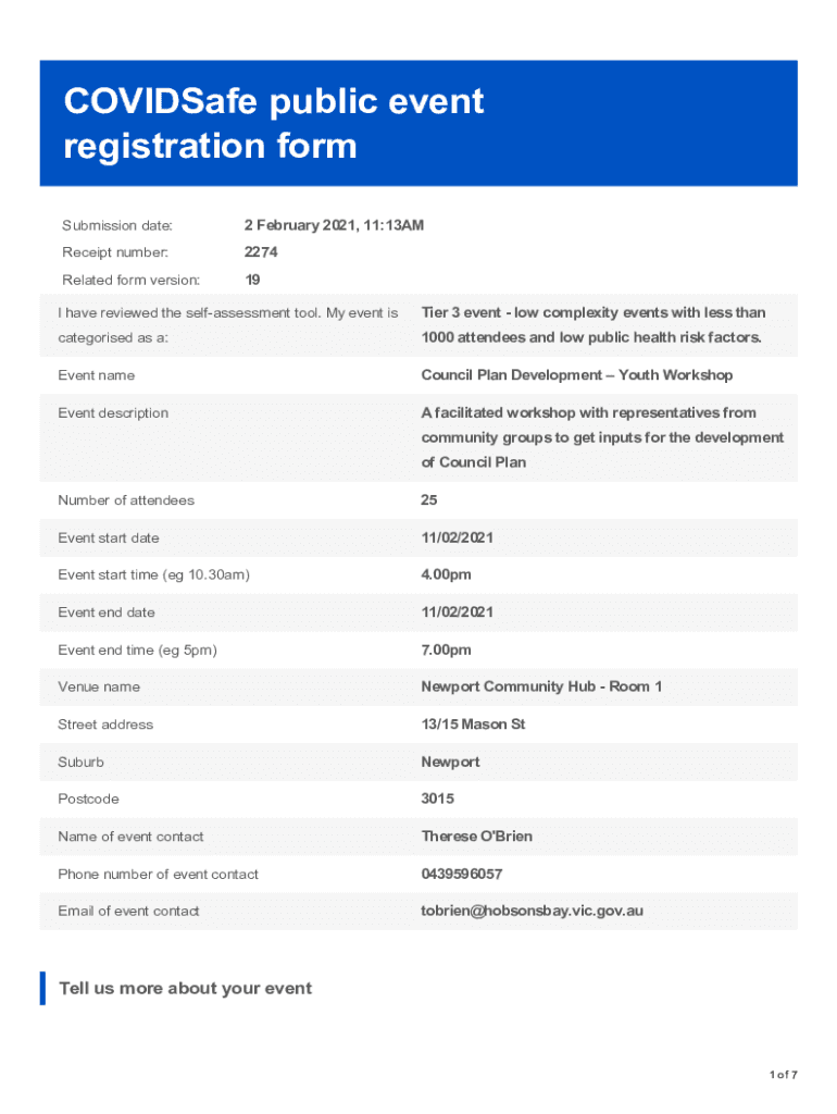 COVIDSafe public event registration form Submission date:2 February 2021, 11:13AMReceipt number:2274Related form version:19I have reviewed the self assessment tool. My event mistier 3 event low complexity
