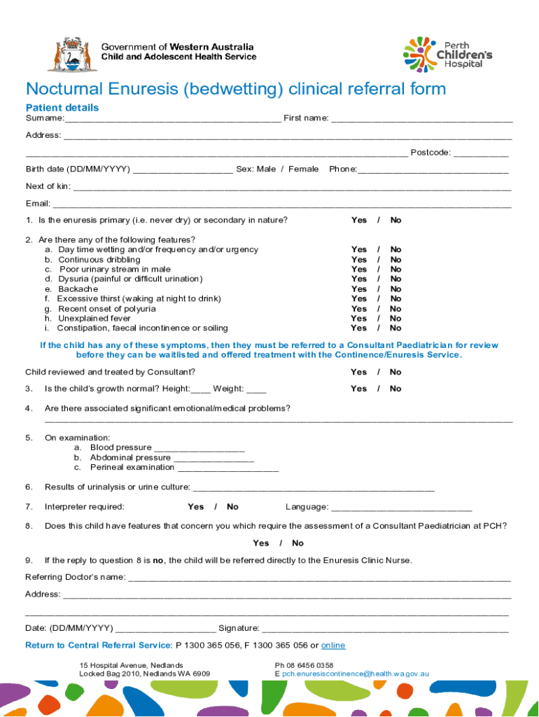 Nocturnal Enuresis (bed-wetting) clinical referral form Patient detailsSurname: First name: Address: Postcode: Birth date (DD/MM/YYY) Sex: Male / Telephone: Next of kin: Email: 1. Is the enuresis