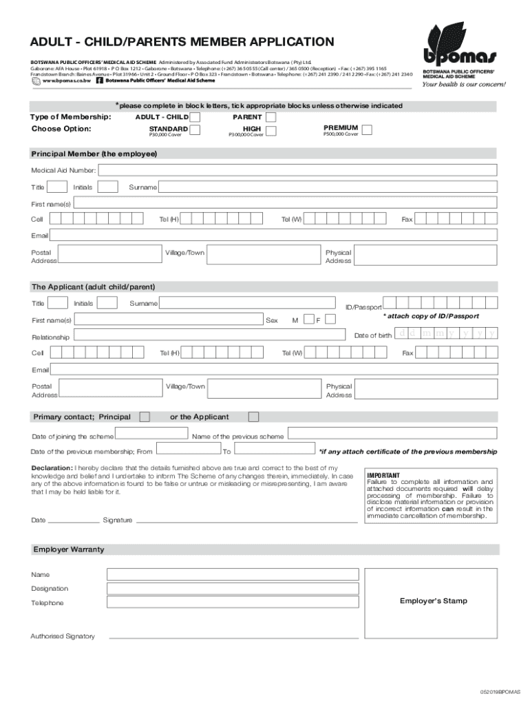 ADULT CHILD/PARENTS MEMBER APPLICATION BOTSWANA PUBLIC OFFICERS MEDICAL AID SCHEME Administered by Associated Fund Administrators Botswana (Pty) Ltd. Gaborone: AFA House Plot 61918 P O Box 1212 Gaborone