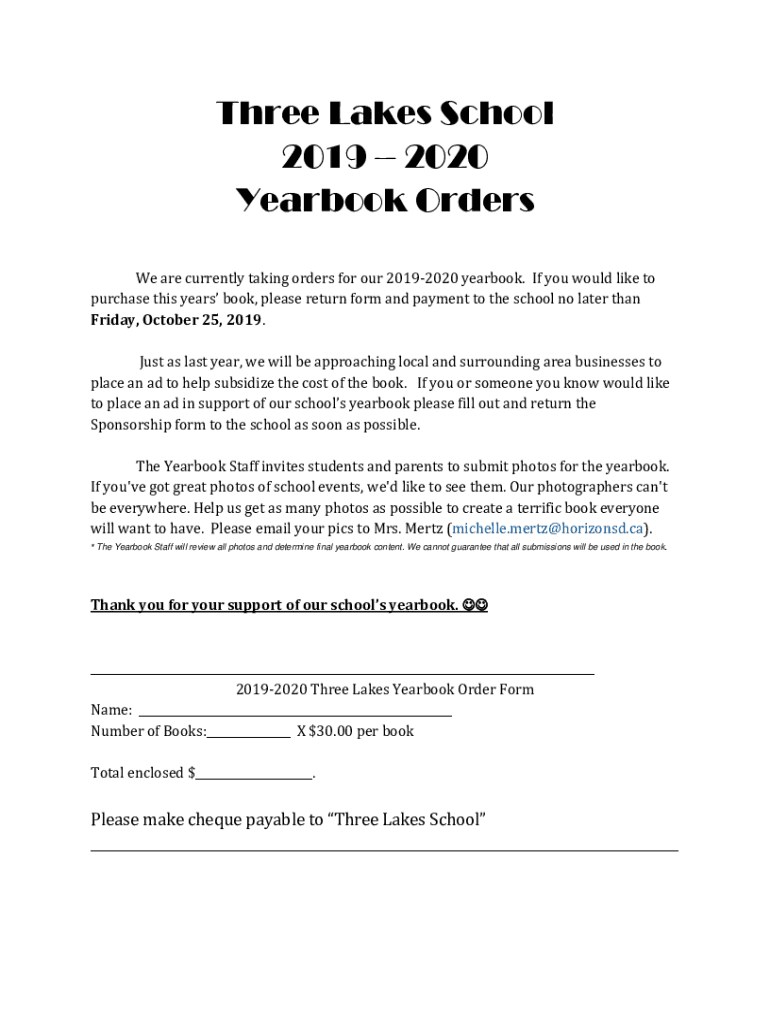 Three Lakes School 2019 2020 Yearbook Orders We are currently taking orders for our 20192020 yearbook. If you would like to purchase this year's book, please return form and payment to the school