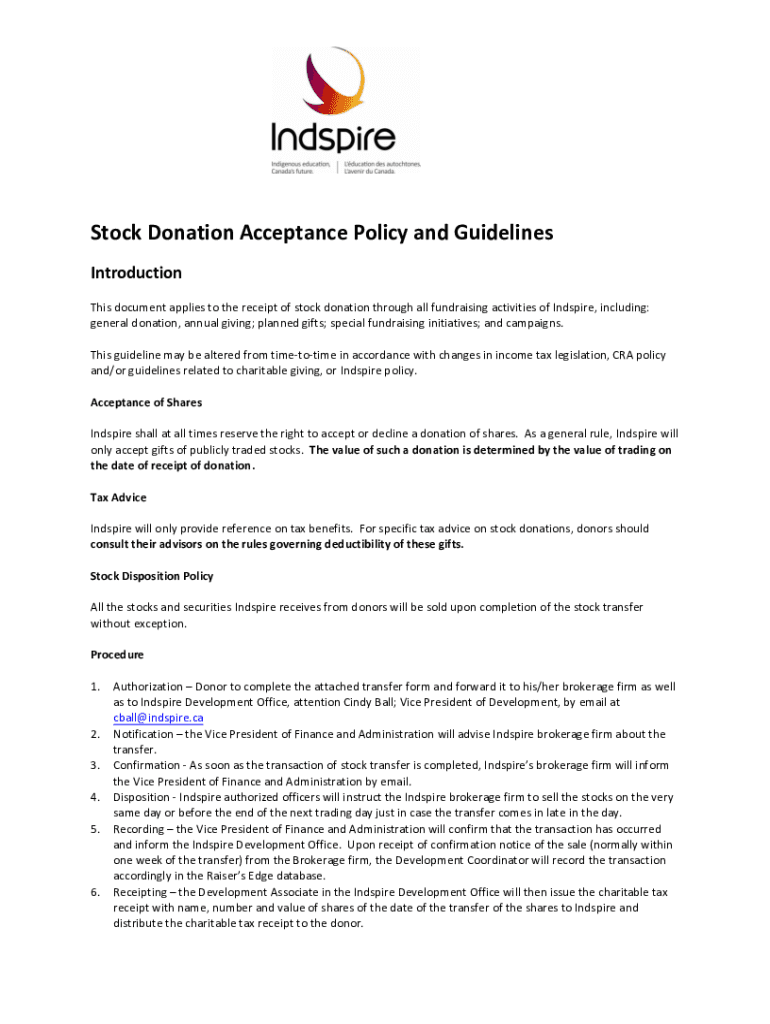This document applies to the receipt of stock donation through all fundraising activities of Inspire, including: