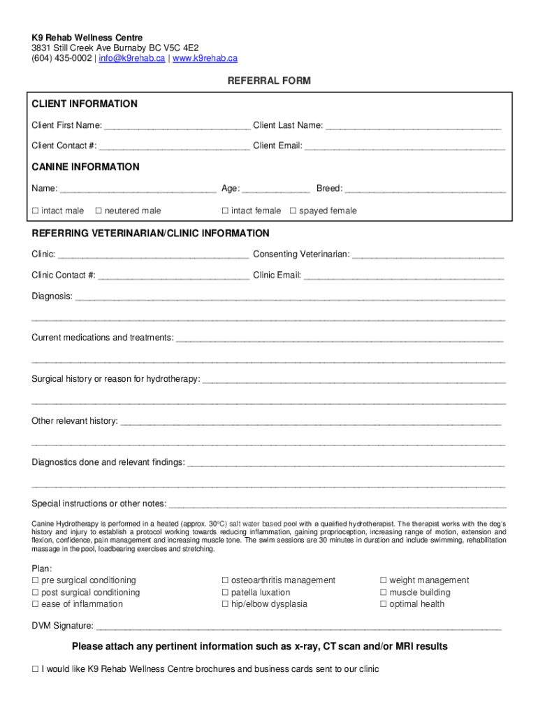 K9 Rehab Wellness Center 3831 Still Creek Ave Burnaby BC V5C 4E2 (604) 4350002 info k9rehab.ca www.k9rehab.caREFERRAL FORM CLIENT INFORMATION Client First Name: Client Last Name: Client Contact #:
