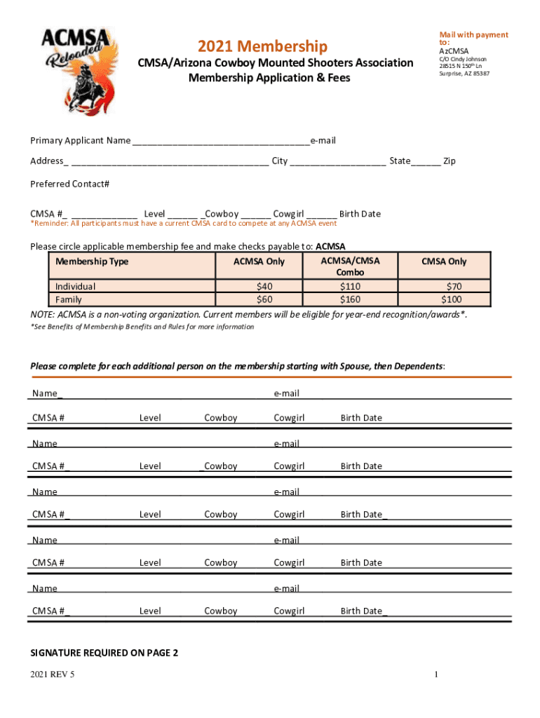 Mail with payment to: AzCMSA2021 Membership/O Cindy Johnson 28515 N 150th Ln Surprise, AZ 85387CMSA/Arizona Cowboy Mounted Shooters Association Membership Application & Pre-primary Applicant Name