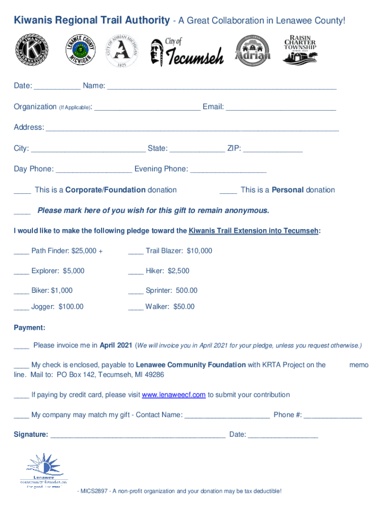Kiwanis Regional Trail Authority A Great Collaboration in Lena wee County! Date: Name: Organization (If Applicable): Email: Address: City: State: ZIP: Day Phone: Evening Phone: This is a Corporate/Foundation