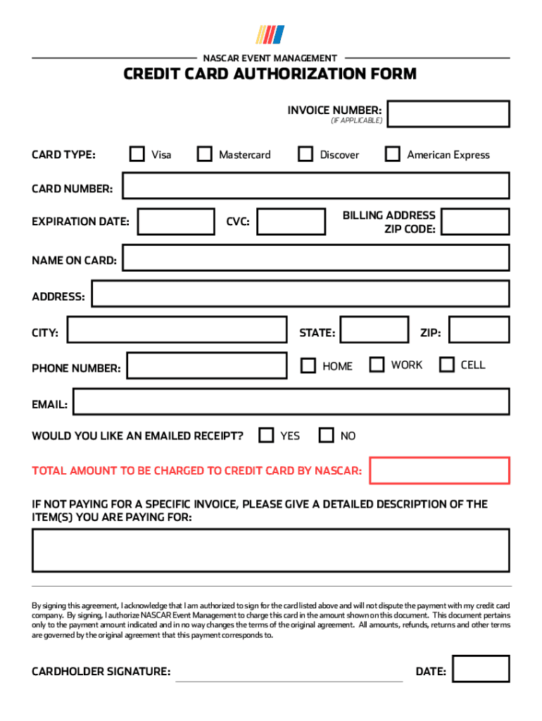 Get the free NASCAR EVENT MANAGEMENT CREDIT CARD AUTHORIZATION FORM