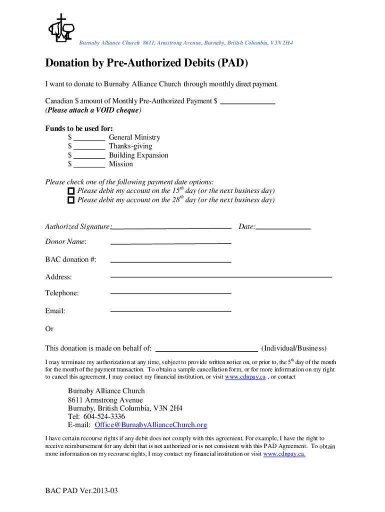 Burnaby Alliance Church 8611, Armstrong Avenue, Burnaby, British Columbia, V3N 2H4Donation by PreAuthorized Debits (PAD)