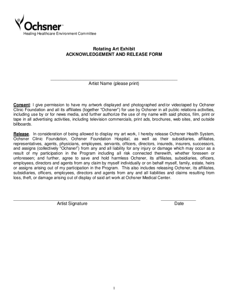 Healing Healthcare Environment CommitteeRotating Art Exhibit ACKNOWLEDGEMENT AND RELEASE FORM Artist Name (please print)Consent: I give permission to have my artwork displayed and photographed and/or