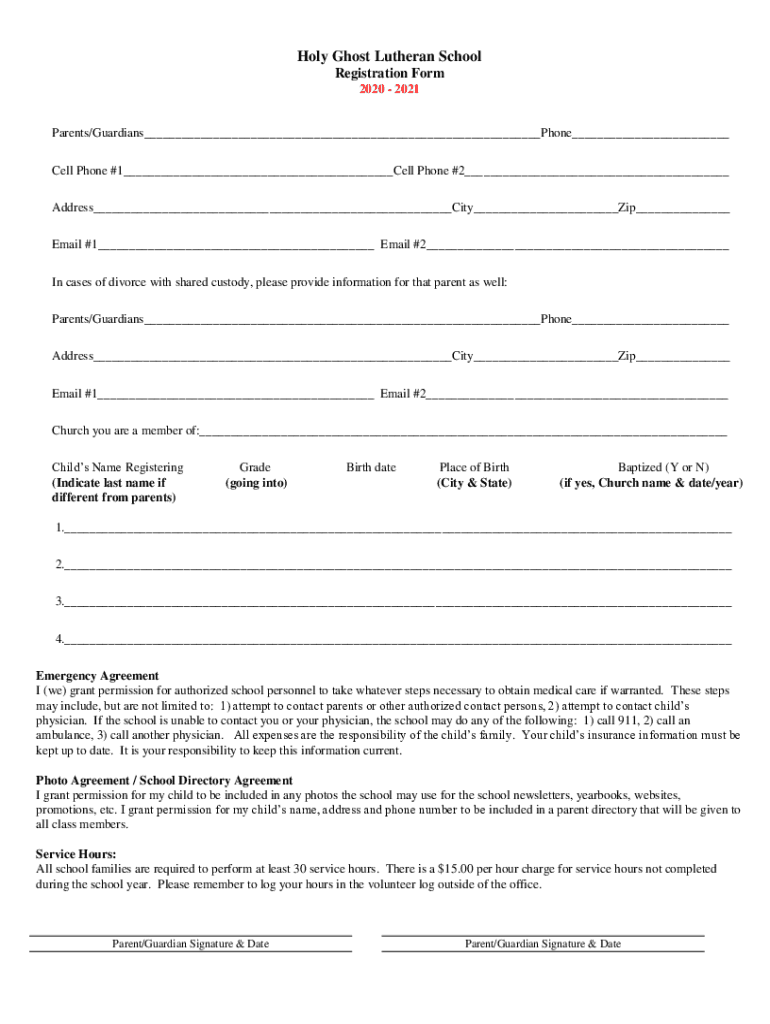 Holy Ghost Lutheran School Registration Form 2020 2021Parents/Guardians Phone Cell Phone #1 Cell Phone #2 Address City Zip Email #1 Email #2 In cases of divorce with shared custody, please provide