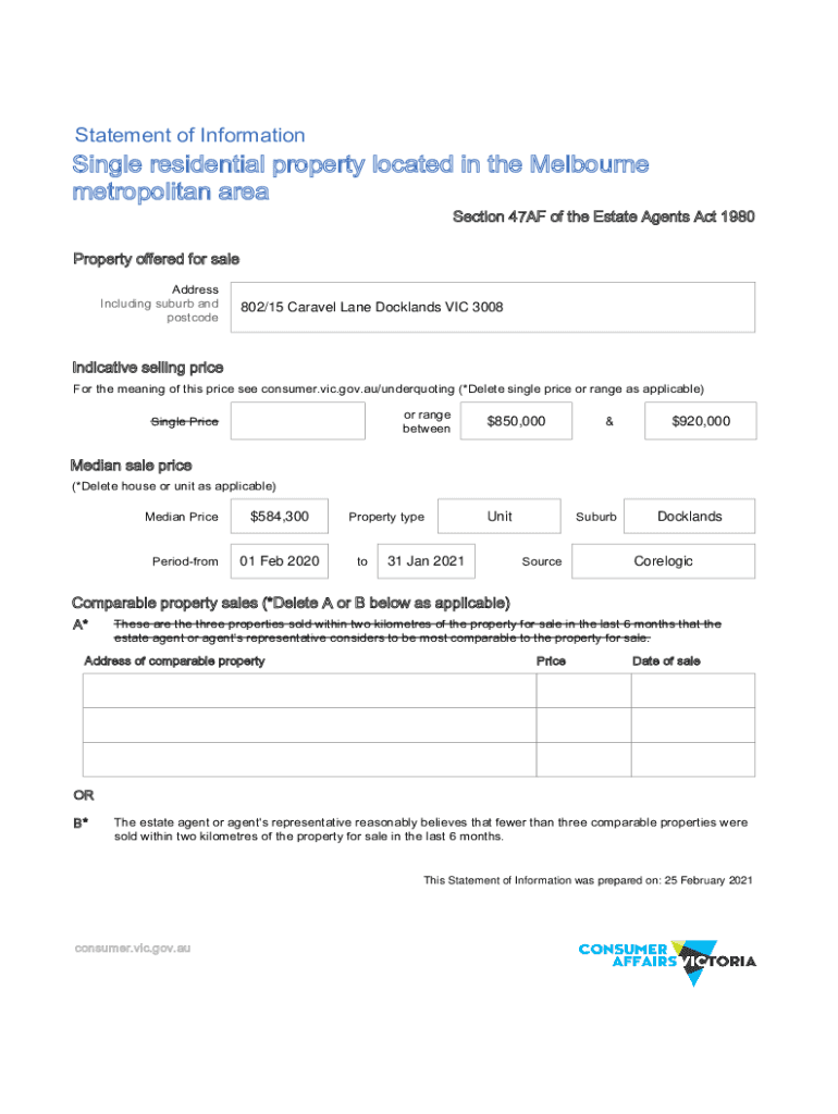 Statement of InformationSingle residential property located in the Melbourne metropolitan area Section 47AF of the Estate Agents Act 1980 Property offered for sale Address Including suburb and postcode802/15