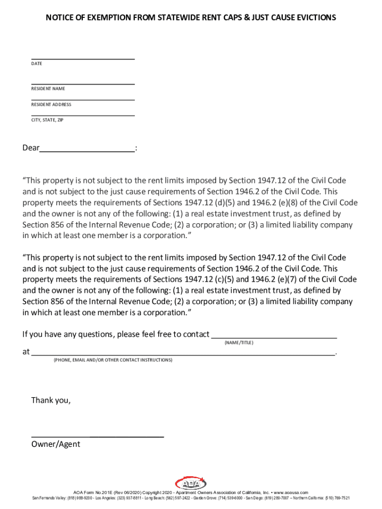NOTICE OF EXEMPTION FROM STATEWIDE RENT CAPS & JUST CAUSE EVICTIONSDATERESIDENT NAME RESIDENT ADDRESS CITY, STATE, Zippier:This property is not subject to the rent limits imposed by Section 1947.12