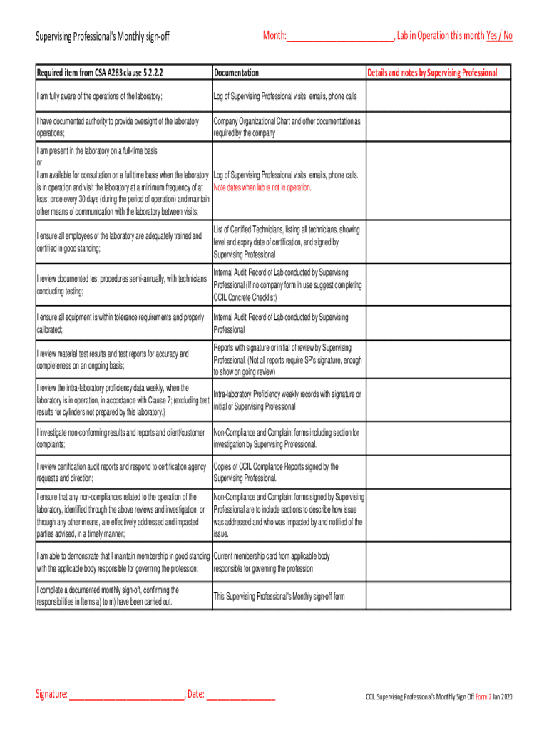 Month:, Lab in Operation this month Yes / Supervising Professional's Monthly sign off Required item from CSA A283 clause 5.2.2.2DocumentationI am fully aware of the operations of the laboratory;Log