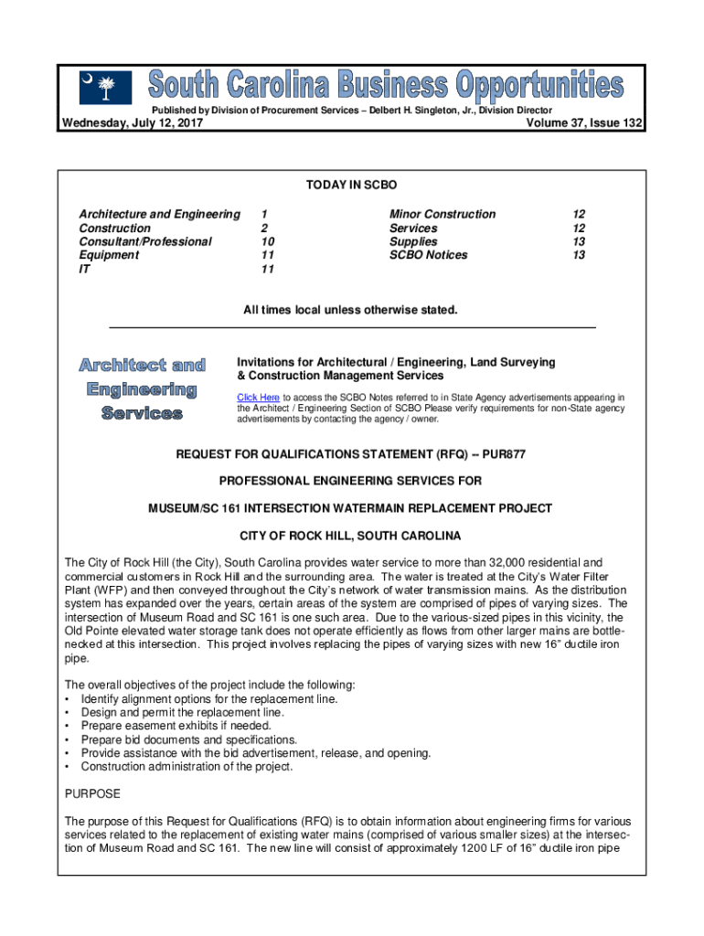 Published by Division of Procurement Services Delbert H. Singleton, Jr., Division Director Wednesday, July 12, 2017Volume 37, Issue 132TODAY IN CBO Architecture and Engineering Construction Consultant/Professional
