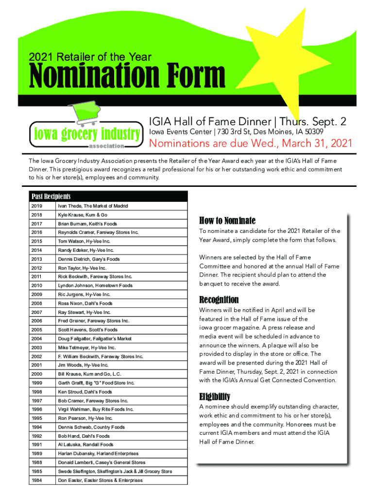 2021 Retailer of the Renomination Form IGA Hall of Fame Dinner Thurs. Sept. 2 Iowa Events Center 730 3rd St, Des Moines, IA 50309Nominations are due Wed., March 31, 2021, The Iowa Grocery Industry