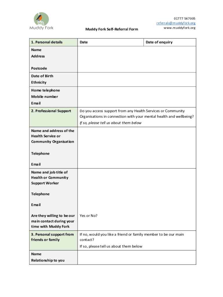 Muddy Fork Self Referral is for individuals who are seeking assistance or support in a specific area, such as mental health or social services. It can be used by anyone who wants to refer themselves for help from Muddy Fork or its affiliated organizations.