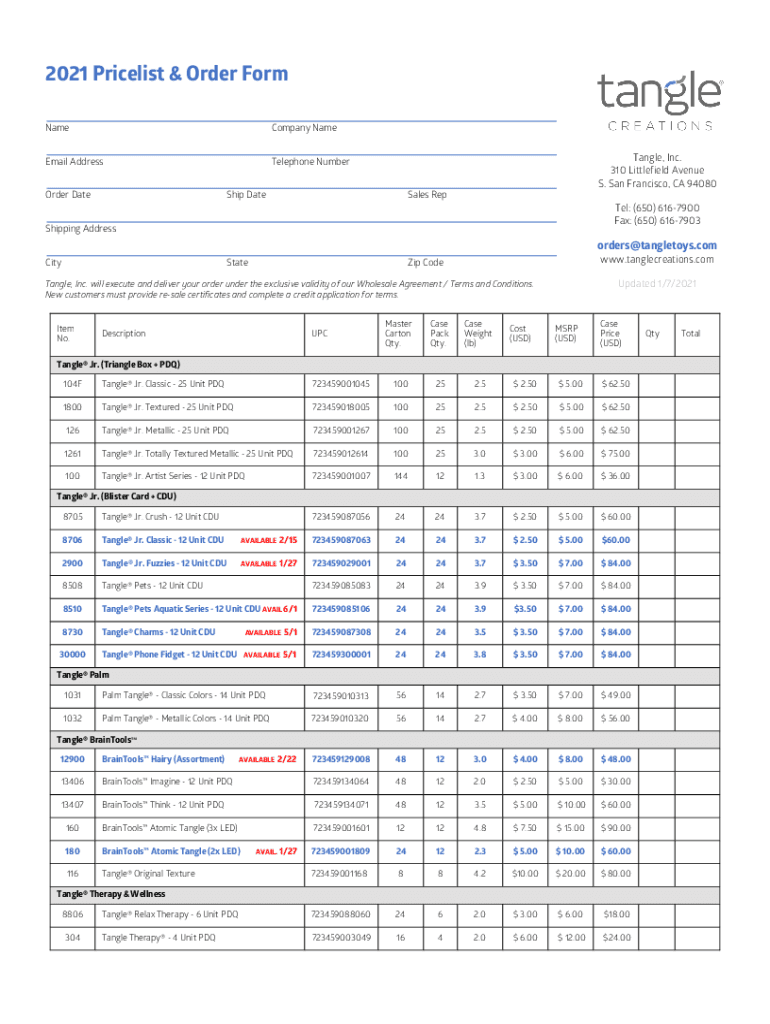2021 Price list & Order Form Accompany NameEmail AddressTelephone NumberOrder Detangle, Inc. 310 Little field Avenue S. San Francisco, CA 94080Ship Date Sales Repel: (650) 6167900 Fax: (650) 6167903Shipping