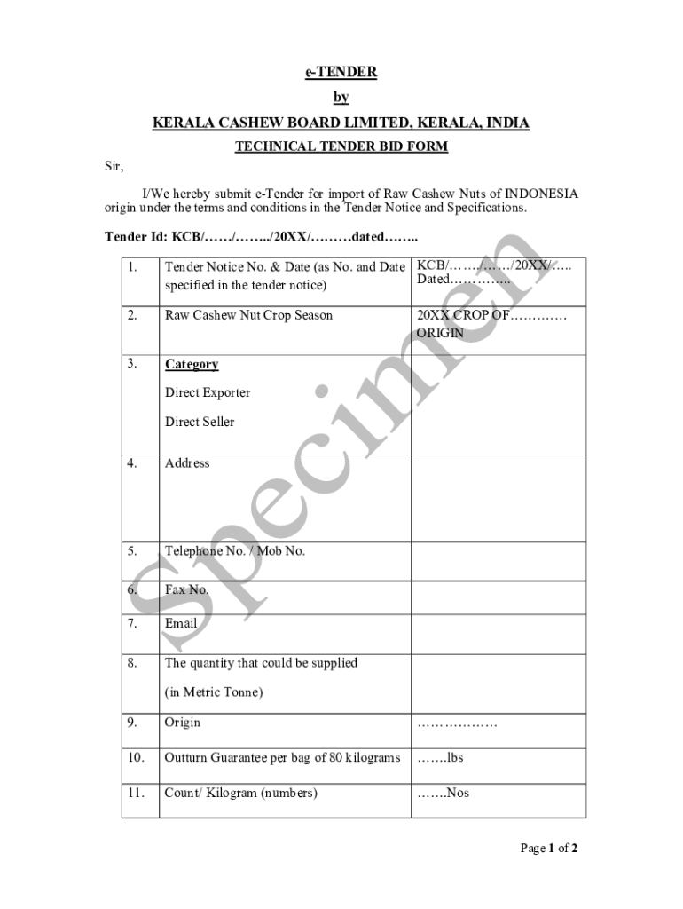 TENDER by KERALA CASHEW BOARD LIMITED, KERALA, INDIA TECHNICAL TENDER BID FORM Sir, I/We hereby submit tender for import of Raw Cashew Nuts of INDONESIA origin under the terms and conditions in the