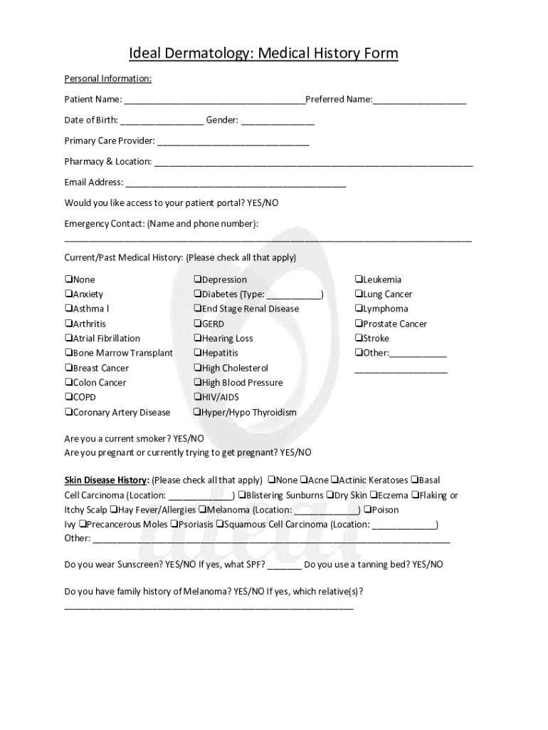 Ideal Dermatology: Medical History Form Personal Information: Patient Name: Preferred Name: Date of Birth: Gender: Primary Care Provider: Pharmacy & Location: Email Address: Would you like access