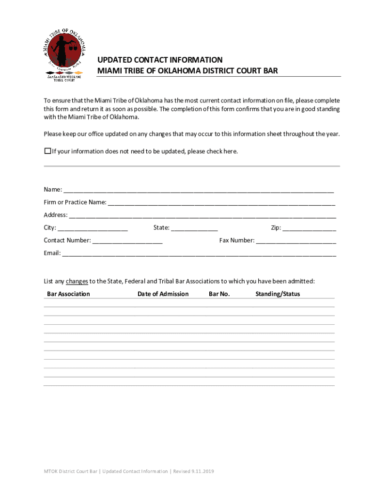 UPDATED CONTACT INFORMATION MIAMI TRIBE OF OKLAHOMA DISTRICT COURT BAR To ensure that the Miami Tribe of Oklahoma has the most current contact information on file, please complete this form and return