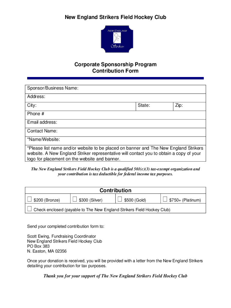 New England Strikers Field Hockey ClubCorporate Sponsorship Program