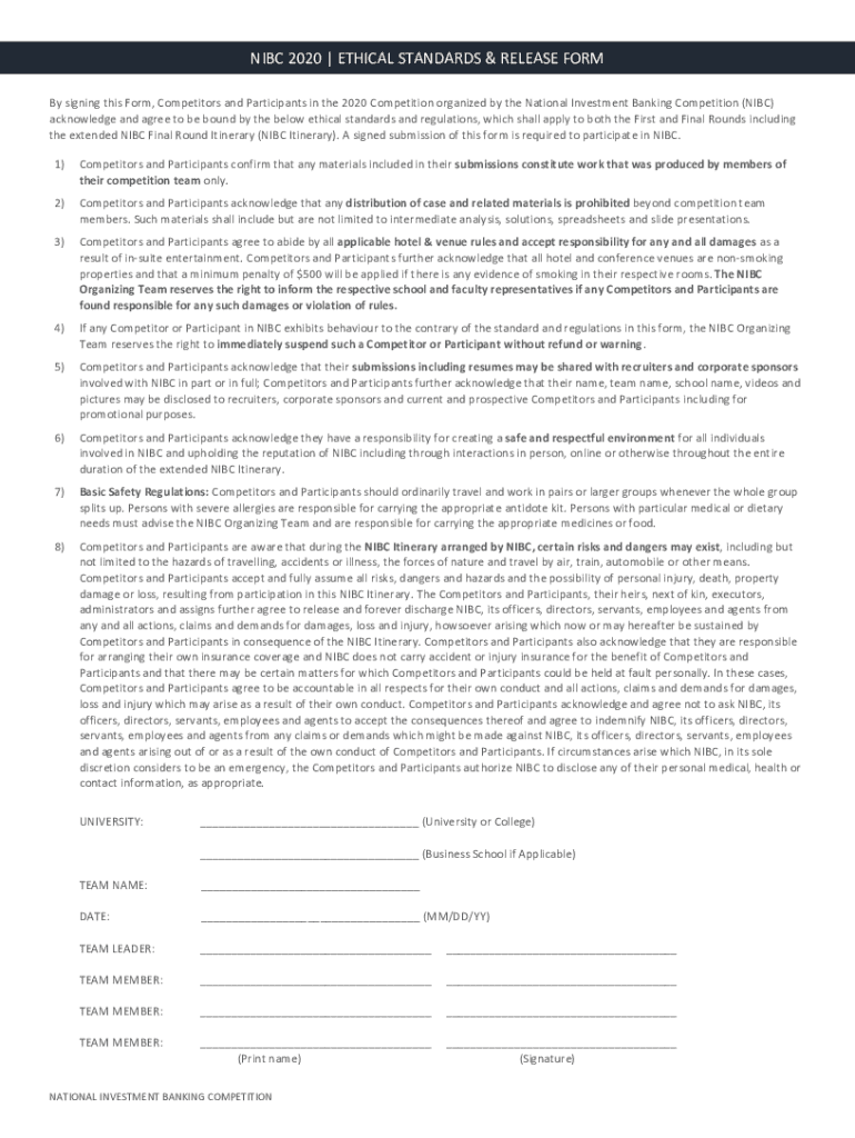 NIBS 2020 ETHICAL STANDARDS & RELEASE FORM By signing this Form, Competitors and Participants in the 2020 Competition organized by the National Investment Banking Competition (NIBS) acknowledge and
