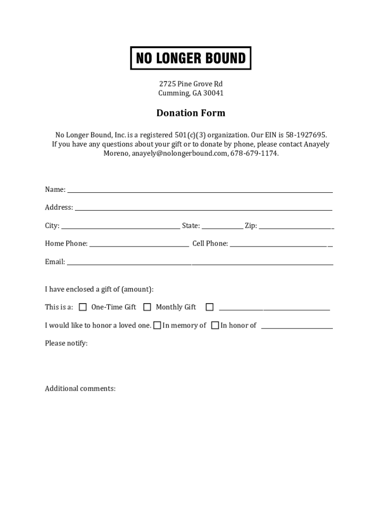 2725 Pine Grove Rd Cumming, GA 30041Donation Form No Longer Bound, Inc. is a registered 501(c)(3) organization. Our EIN is 581927695. If you have any questions about your gift or to donate by phone,