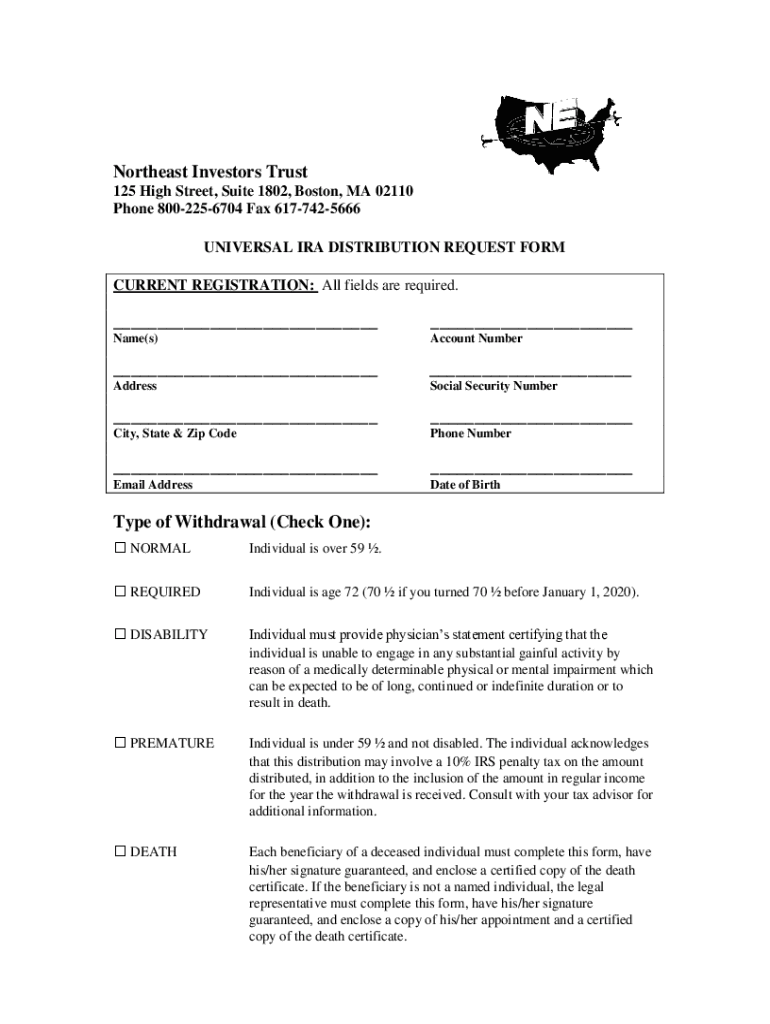 Northeast Investors Trust 125 High Street, Suite 1802, Boston, MA 02110 Phone 8002256704 Fax 6177425666 UNIVERSAL IRA DISTRIBUTION REQUEST FORM CURRENT REGISTRATION: All fields are required. Name(s)Account