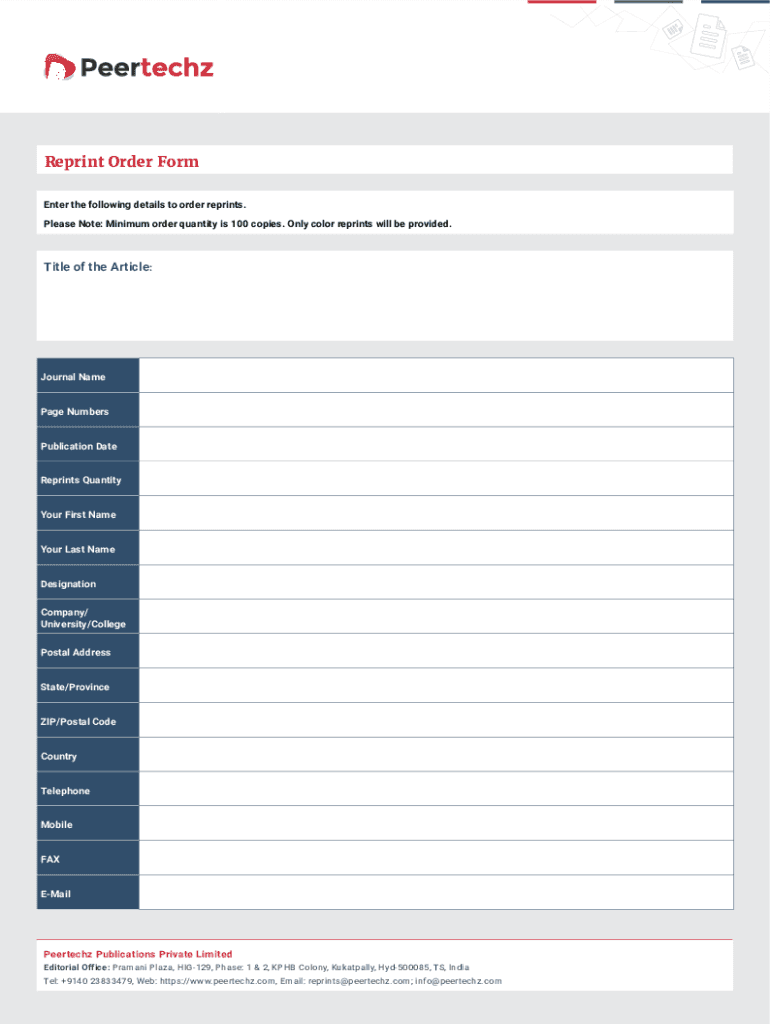Reprint Order Form Enters the following details to order reprints. Please Note: Minimum order quantity is 100 copies. Only color reprints will be provided. Title of the Article:Journal Nominal Amount