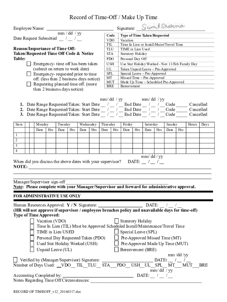 Record of Takeoff / Make Up Time Employee Name:mm / dd / by Date Request Submitted / / Reason/Importance of Time Off: Taken/Requested Time Off Code & Notice Table: Emergency time off has been taken