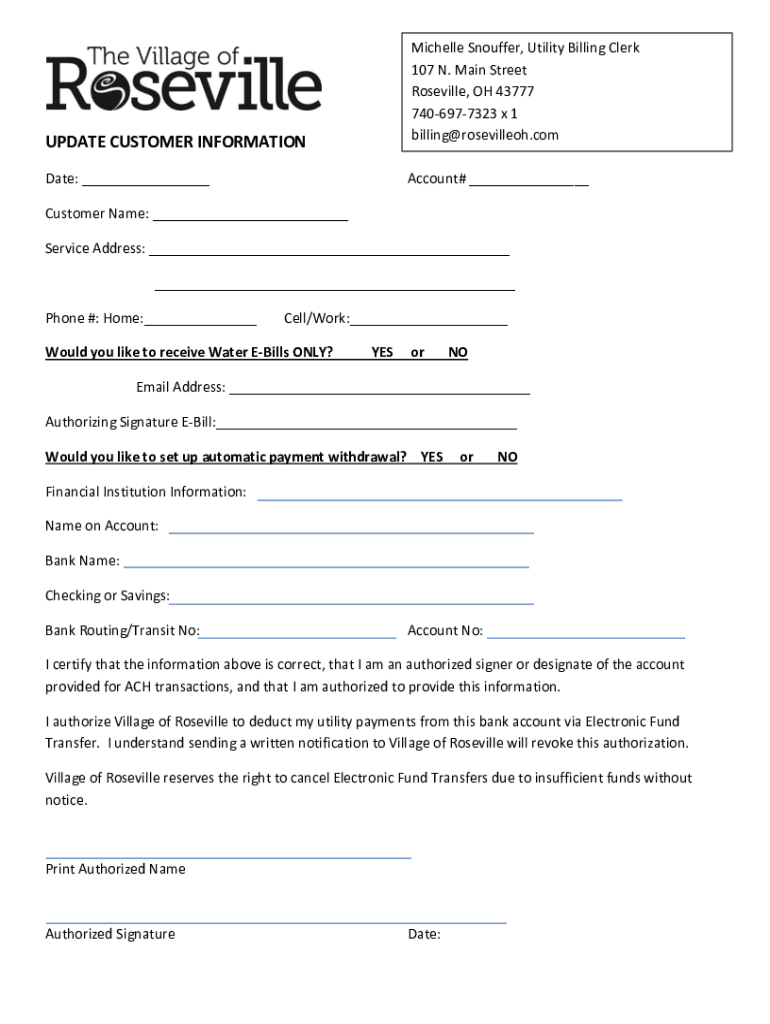 Michelle Snuffer, Utility Billing Clerk 107 N. Main Street Roseville, OH 43777 7406977323 × 1 billing Roseville. Complete CUSTOMER INFORMATION Date: Account# Customer Name: Service Address: Phone