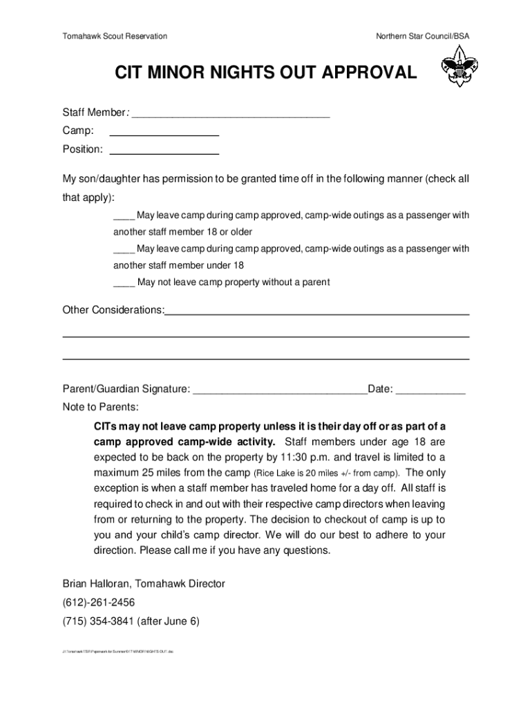 Tomahawk Scout ReservationNorthern Star Council/BSA CIT MINOR NIGHTS OUT APPROVAL Staff Member: Camp: Position: My son/daughter has permission to be granted time off in the following manner (check