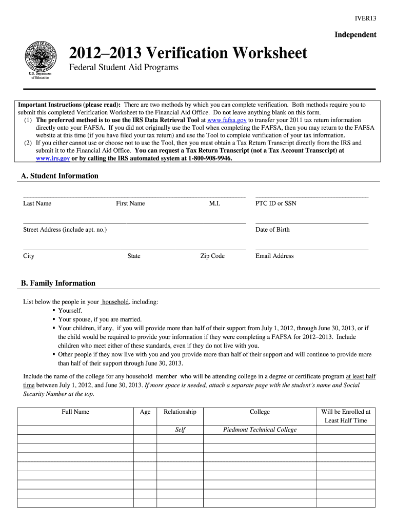 Dependent and independent students are required to complete the 2012–2013 Verification Worksheet based on their specific circumstances. This includes students whose FAFSA submissions indicate potential discrepancies that necessitate further verification.