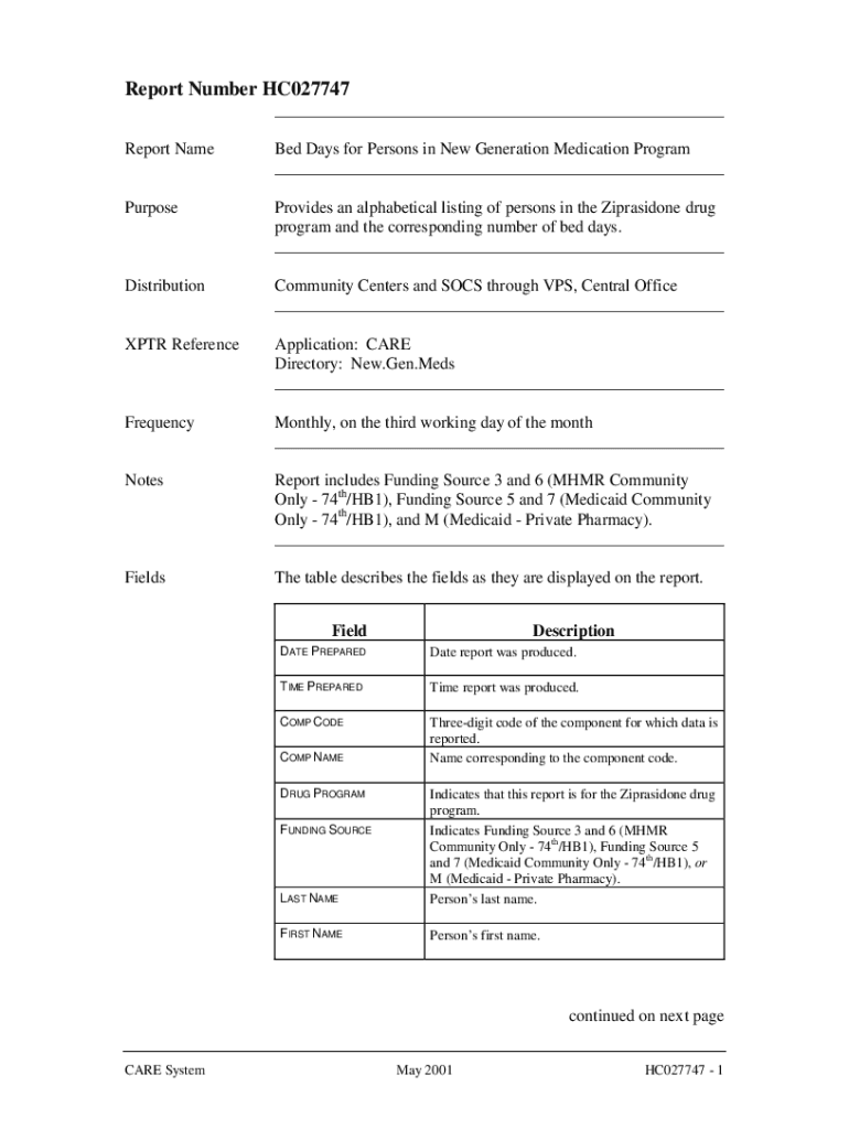 Report Number HC027747 Report Named Days for Persons in New Generation Medication Program PurposeProvides an alphabetical listing of persons in the drug program and the corresponding number of bed