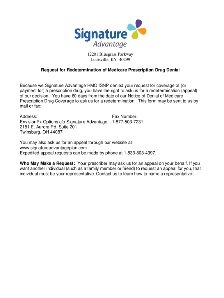 Request for Redetermination of Medicare Prescription Drug DenialBecause we Signature Advantage HMO ISP denied your request for coverage of (or